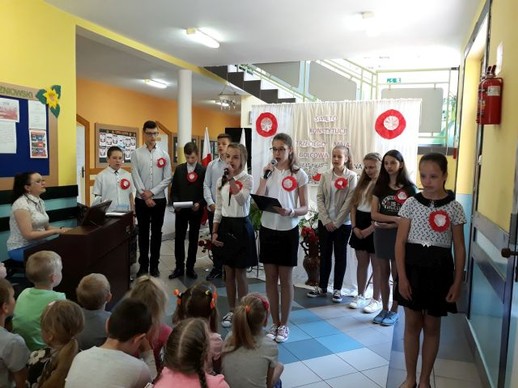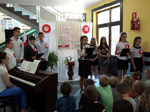 Realizując program wychowawczy szkoły, a szczególnie próbując kształtować wśród młodych ludzi właściwe postawy patriotyczne w naszej szkole odbyła się uroczysta akademia poświęcona upamiętnieniu kolejnej rocznicy uchwalenia Konstytucji 3 maja. Ciągła praca wychowawcza nauczycieli w ramach kształtowania postaw patriotycznych ma na celu: rozbudzanie w dzieciach poczucia odpowiedzialności za losy Ojczyzny; przygotowanie młodzieży do aktywnego działania na rzecz systematycznego rozwoju Ojczyzny; pogłębianie wiedzy o kraju ojczystym i jego historii; systematycznego wpajania młodzieży norm zachowania się w określonych sytuacjach; przestrzeganie prawa i moralnego postępowania w życiu, uczenia sumienności, rzetelności, obowiązkowości, prawdomówności, samokontroli, uczciwej, samodzielnej pracy i nauki, zachęcania do koleżeńskiej pomocy i wytrwałości w wysiłku, a także wpajania szacunku dla ludzi starszych i przełożonych. Piękna i patriotyczna uroczystość, związana z 227 rocznicą uchwalenia Konstytucji 3 Maja oraz z przypadającym w dniu 2 maja – świętu flagi państwowej. Akademia ta wpisana była również w obchody całoroczne w naszej placówce 100 rocznicy odzyskania przez Polskę niepodległości. Uczniowie klas szóstej i siódmej przygotowali w związku z tym wydarzeniem montaż słowno – muzyczny poświęcony jednej z najważniejszych ustaw w historii Polski. Uchwalona przez Sejm Wielki w 1791 r. Konstytucja była drugą na świecie i pierwszą w Europie ustawą tego typu. Autorami Konstytucji 3 Maja byli: Stanisław August Poniatowski, Ignacy Potocki i Hugo Kołłątaj. Polska stała się monarchią parlamentarną, zniesiono liberum veto, wolne elekcje oraz konfederacje. Znacznie wzmocniło to władzę państwową. Od tej pory pod opiekę prawa i rządu trafiała nie tylko szlachta, ale również mieszczanie i chłopi.