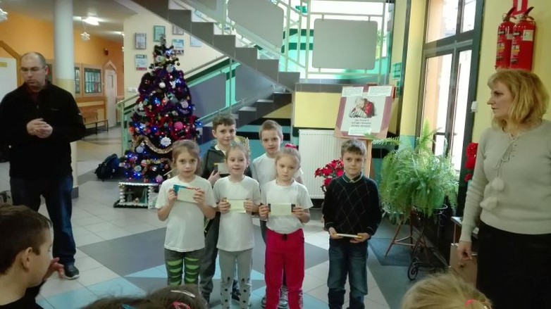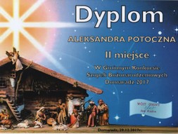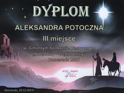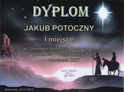 Gmina Komisja Konkursowa nagrodziła uczestników etapu gminnego Konkursu Plastycznego „Kolędnicy-wędrownicy”. Temat Konkursu „KOLĘDNICY–WĘDROWNICY”, dotyczył dawnej oraz obecnej tradycji kolędowania. Należało w pracy konkursowej przedstawić całe sceny wielopostaciowe, lub poszczególne – ulubione postacie kolędujące. Organizator pragnął przypomnieć dzieciom o ciekawej tradycji, która obecnie powoli odchodzi w zapomnienie. Komisja w powyższym konkursie przyznała I miejsce Jakubowi Potocznemu z klasy VII, II miejsce przypadło Hubertowi Bąkowi – z klasy IV, a III miejsce stało się udziałem Aleksandry Potocznej również z klasy IV.