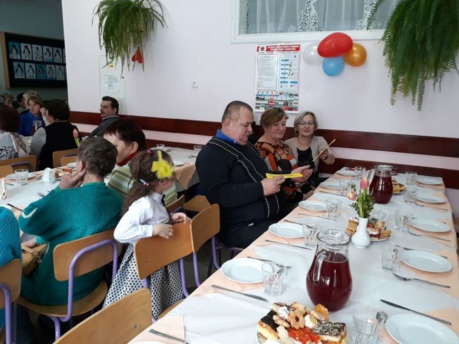Pani Dyrektor przedstawiła również działania szkoły zmierzające do kształtowania postaw patriotycznych naszych wychowanków utożsamianych z miejscem, w którym się wychowują. Zacieśnianiu związków emocjonalnych między członkami rodzin naszych uczniów i szkołą, a także regionem, w którym żyją służy umożliwianie im wspólnego przeżywania ważnych uroczystości rodzinnych, patriotycznych czy religijnych. Padły też słowa o konieczności kształtowania postaw szacunku do ludzi starszych, wdzięczności zarówno za wspomaganie rodziców w procesie wychowania młodych pokoleń, jak też za okazywaną przez seniorów bezinteresowną miłość do wnucząt.