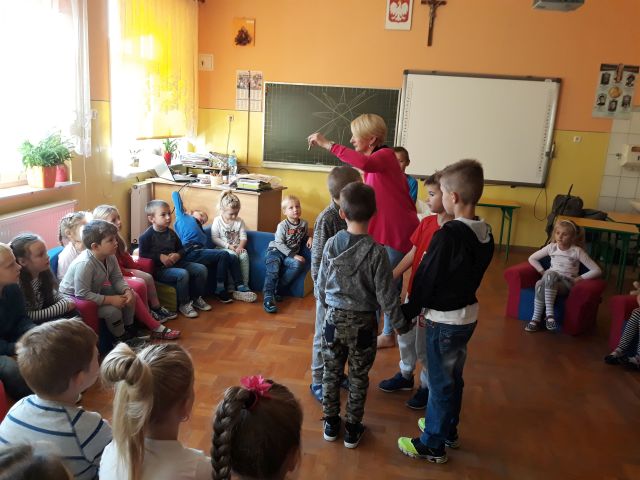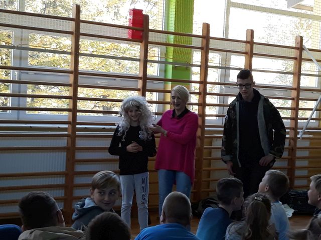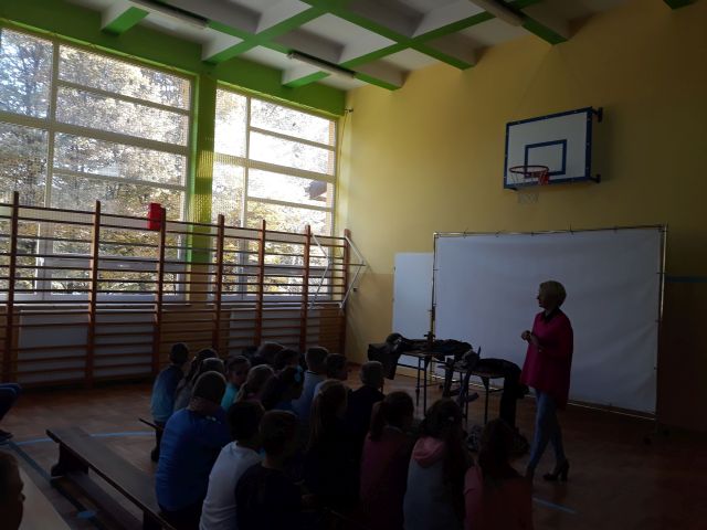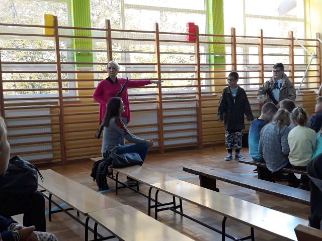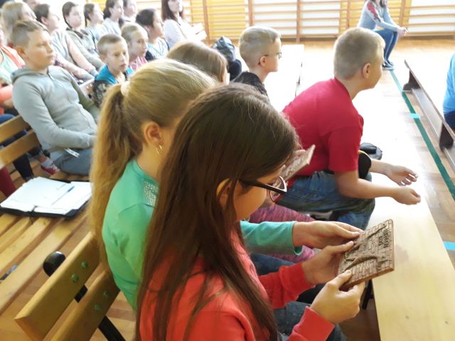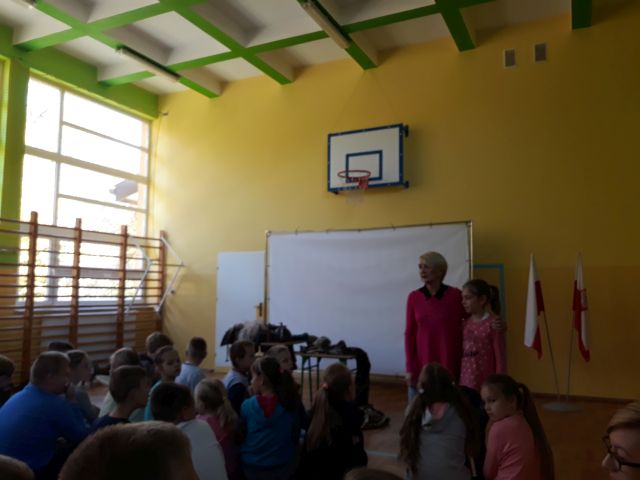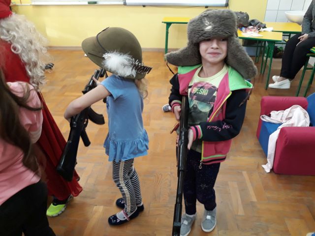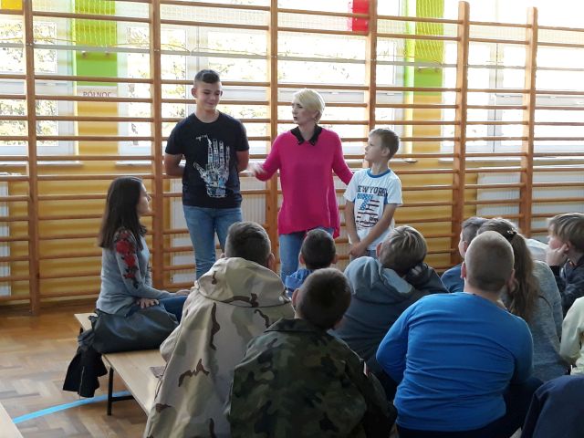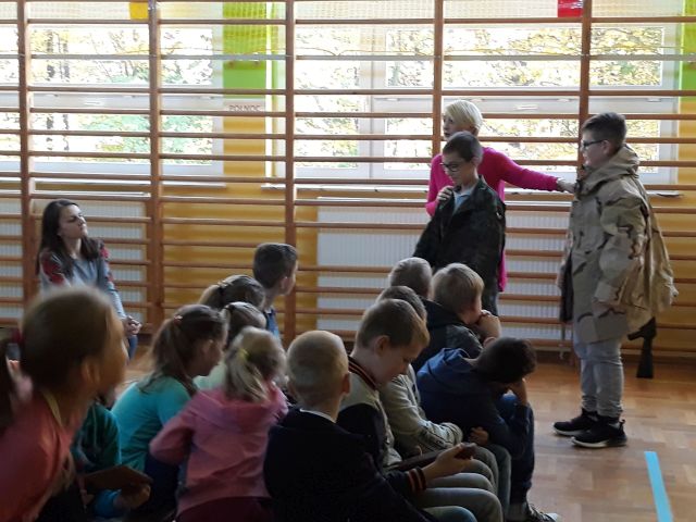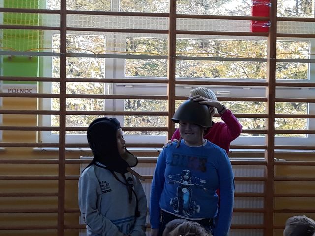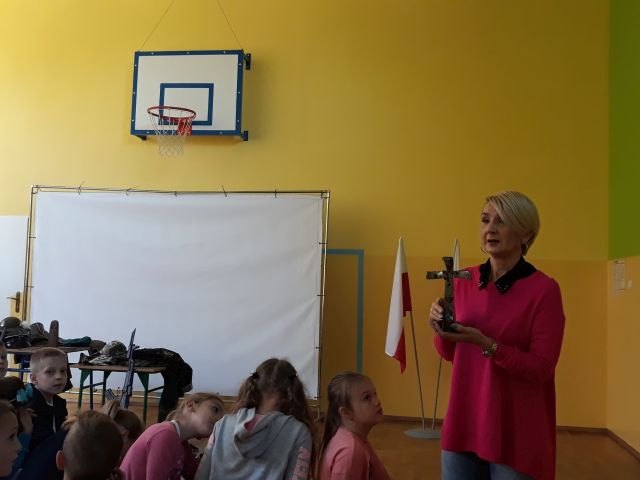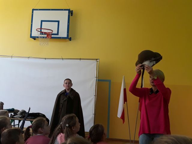 Uczniowie klas IV - VIII brali udział w niezapomnianej lekcji historii, podczas której mieli okazję poznać ciekawostki historyczne o znanych Polakach, połączone z nauką o wartościach patriotycznych. Podczas niezwykle interesujących zajęć uczniowie zostali przeniesieni w niesamowity świat wydarzeń z przeszłości naszego kraju. Dzieci z uwagą słuchały o istnieniu takich postaci, jak np. Krystyna Skarbek, która zapisała się na kartach historii Polski jako bohaterka. Dowiedziały się również o mało znanych wydarzeniach z życia Józefa Piłsudskiego, a także wielu innych znamienitych ludziach. Uczniowie z przejęciem słuchali o czynach niezwykłych osób, które stały się dla nich przykładem pozytywnych postaw oraz wartości, które powinny przyświecać każdemu patriocie. Niektórzy mieli okazję przymierzyć mundury żołnierskie, hełmy, maski przeciwgazowe, a także potrzymać i obejrzeć z bliska atrapę karabinu, pocisku moździerzowego i innych ciekawych przedmiotów. Wiedza historyczna została wzbogacona o zaskakujące anegdoty i pokaz rekwizytów. Z tak doskonale przeprowadzonej lekcji historii uczniowie wynieśli bogatą wiedzę o znanych Polakach, która na pewno zapadnie głęboko w ich pamięci.
