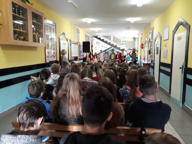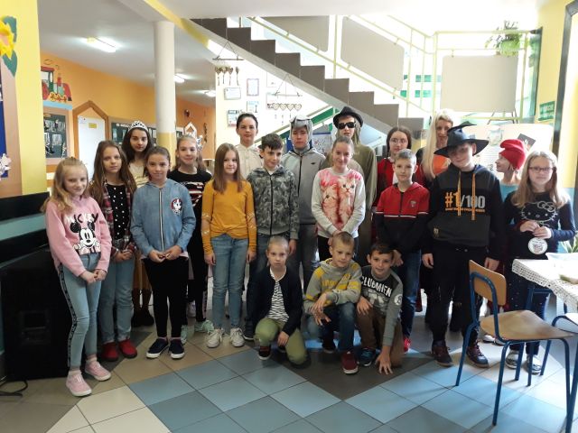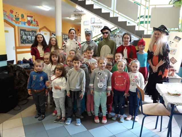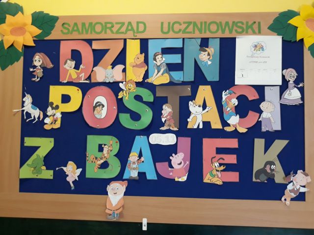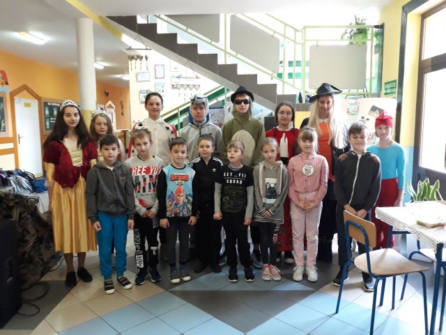 Międzynarodowy Dzień Postaci z Bajek obchodzony jest na całym świecie 5 listopada. Jest to święto wszystkich postaci bajkowych i znakomity moment, aby przypomnieć sobie niektóre z nich. Bajki towarzyszą nam od najmłodszych lat, rozweselają i bawią, ale także przekazują nam ważne prawdy życiowe i uczą uniwersalnych wartości moralnych. Tegoż też dnia w naszej szkole zawitały ciekawe postacie bajkowe, w których role wcielili się uczniowie z klasy siódmej i ósmej wraz z opiekunem samorządu szkolnego. Już na samym wejściu dzieci przywitała księżniczka. Nie zabrakło też Czarownicy, Czerwonego Kapturka, Smerfa, Żółwia Franklina, Króla oraz Osiołka. Bajkowe Postacie przeprowadziły z dziećmi liczne quizy i konkursy. Były m.in. zagadki, zabawy, zadanie – przebieranie grochu od fasoli, konkurs piosenki z Krainy Lodu „Mam tę moc” oraz czytanie bajek.