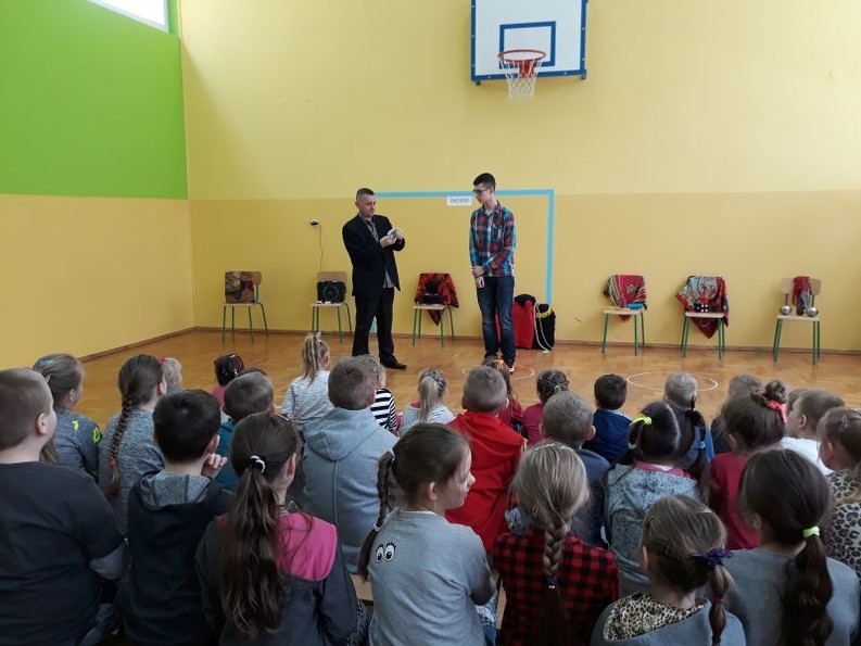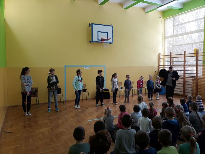 spośród publiczności uczniów, po to, aby również razem z nim uczestniczyli w