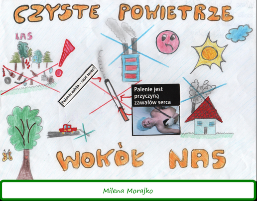Ponadto zorganizowano kącik dla rodziców oraz wystawę prac dzieci „Mamo Tato – NIE PAL”. Realizują program „Czyste powietrze wokół nas” zorganizowany został konkurs plastyczny w którym udział wzięły chętne dzieci z Oddziału Przedszkolnego. Poniżej prezentujemy prace konkursowe.