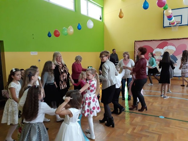 Pani Dyrektor przedstawiła również działania szkoły zmierzające do kształtowania postaw patriotycznych naszych wychowanków utożsamianych z miejscem, w którym się wychowują. Zacieśnianiu związków emocjonalnych między członkami rodzin naszych uczniów i szkołą, a także regionem, w którym żyją służy umożliwianie im wspólnego przeżywania ważnych uroczystości rodzinnych, patriotycznych czy religijnych. Padły też słowa o konieczności kształtowania postaw szacunku do ludzi starszych, wdzięczności zarówno za wspomaganie rodziców w procesie wychowania młodych pokoleń, jak też za okazywaną przez seniorów bezinteresowną miłość do wnucząt.