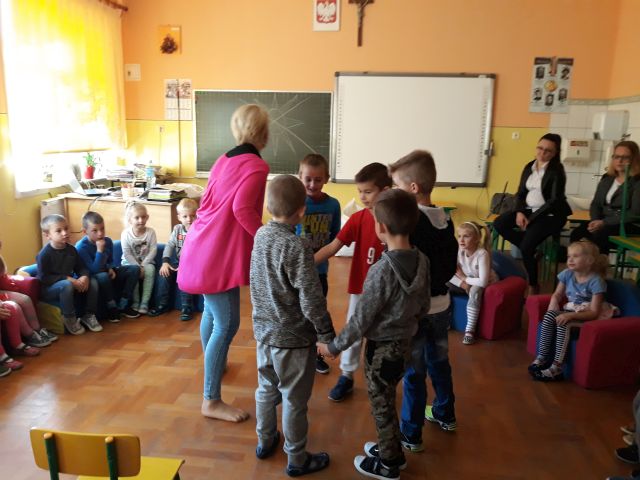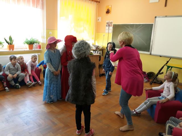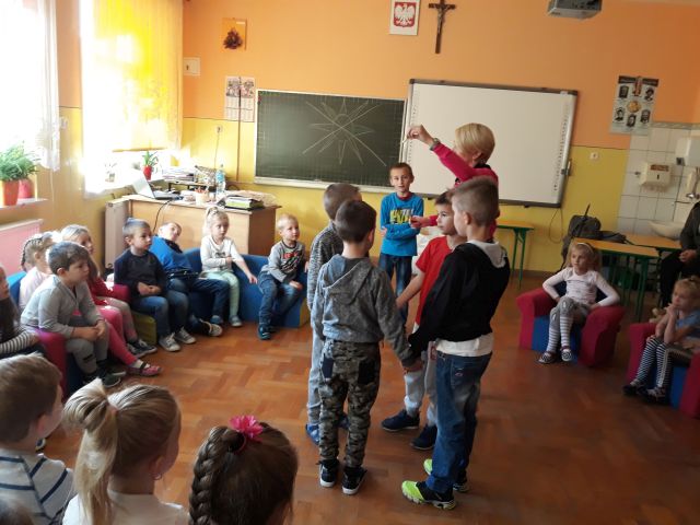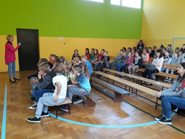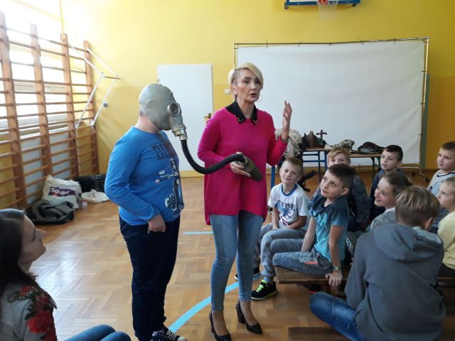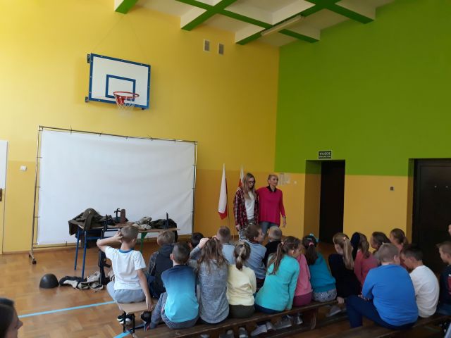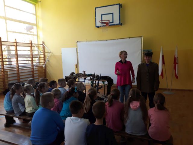 Uczniowie klas IV - VIII brali udział w niezapomnianej lekcji historii, podczas której mieli okazję poznać ciekawostki historyczne o znanych Polakach, połączone z nauką o wartościach patriotycznych. Podczas niezwykle interesujących zajęć uczniowie zostali przeniesieni w niesamowity świat wydarzeń z przeszłości naszego kraju. Dzieci z uwagą słuchały o istnieniu takich postaci, jak np. Krystyna Skarbek, która zapisała się na kartach historii Polski jako bohaterka. Dowiedziały się również o mało znanych wydarzeniach z życia Józefa Piłsudskiego, a także wielu innych znamienitych ludziach. Uczniowie z przejęciem słuchali o czynach niezwykłych osób, które stały się dla nich przykładem pozytywnych postaw oraz wartości, które powinny przyświecać każdemu patriocie. Niektórzy mieli okazję przymierzyć mundury żołnierskie, hełmy, maski przeciwgazowe, a także potrzymać i obejrzeć z bliska atrapę karabinu, pocisku moździerzowego i innych ciekawych przedmiotów. Wiedza historyczna została wzbogacona o zaskakujące anegdoty i pokaz rekwizytów. Z tak doskonale przeprowadzonej lekcji historii uczniowie wynieśli bogatą wiedzę o znanych Polakach, która na pewno zapadnie głęboko w ich pamięci.
