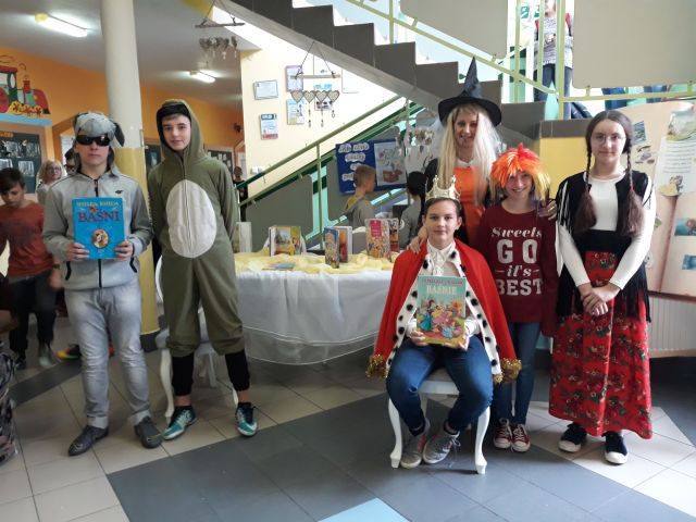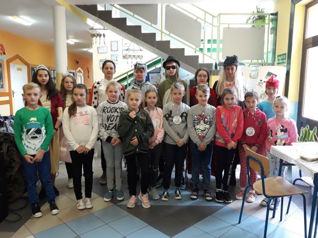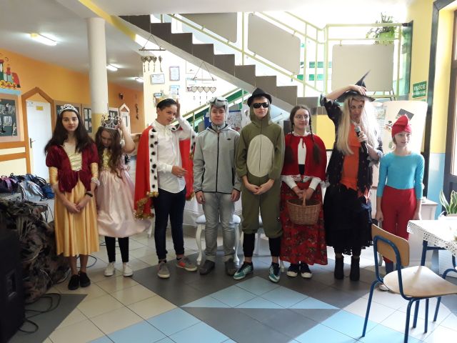 Międzynarodowy Dzień Postaci z Bajek obchodzony jest na całym świecie 5 listopada. Jest to święto wszystkich postaci bajkowych i znakomity moment, aby przypomnieć sobie niektóre z nich. Bajki towarzyszą nam od najmłodszych lat, rozweselają i bawią, ale także przekazują nam ważne prawdy życiowe i uczą uniwersalnych wartości moralnych. Tegoż też dnia w naszej szkole zawitały ciekawe postacie bajkowe, w których role wcielili się uczniowie z klasy siódmej i ósmej wraz z opiekunem samorządu szkolnego. Już na samym wejściu dzieci przywitała księżniczka. Nie zabrakło też Czarownicy, Czerwonego Kapturka, Smerfa, Żółwia Franklina, Króla oraz Osiołka. Bajkowe Postacie przeprowadziły z dziećmi liczne quizy i konkursy. Były m.in. zagadki, zabawy, zadanie – przebieranie grochu od fasoli, konkurs piosenki z Krainy Lodu „Mam tę moc” oraz czytanie bajek.
