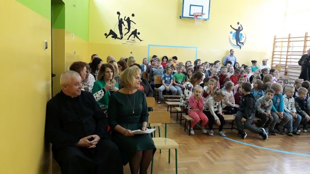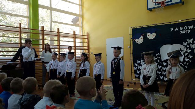 Uczniowie klasy pierwszej wcielili się w role – „Tropicieli Wiedzy”. Przedstawili program artystyczny, w którym udali się w podróż, by odkrywać tajemnice każdej z nauk. Swoim występem udowodnili, że naukę trzeba zdobywać, pogłębiać i pielęgnować, czego efektem będą medale. Recytując wiersze, tańcząc i śpiewając piosenki pięknie się zaprezentowali i zostali nagrodzeni gromkimi brawami.
