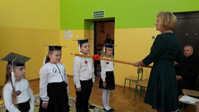 Na zakończenie pierwszoklasiści udali się do swojej sali lekcyjnej, gdzie czekał na nich słodki poczęstunek przygotowany przez rodziców. Niespodziankę przygotowali również Pan Kazimierz Barański i Pan Wacław Bieńczak, których pomoc i zaangażowanie w tą uroczystość była nieoceniona.