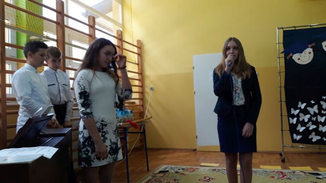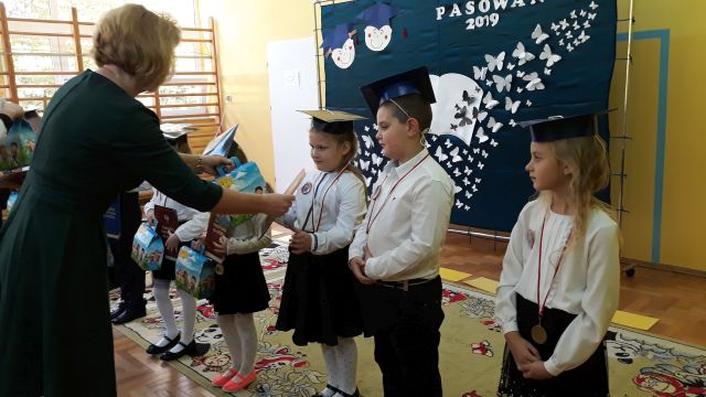 Po złożeniu ślubowania – Dyrektor Szkoły dokonała pasowania uczniów klasy pierwszej, a Przewodniczący Samorządu Uczniowskiego – Jakub Trzciński wraz z sekretarzem – Dominikiem Dydakiem wręczyli pierwszoklasistom medale upamiętniające ten wielki dla nich dzień.