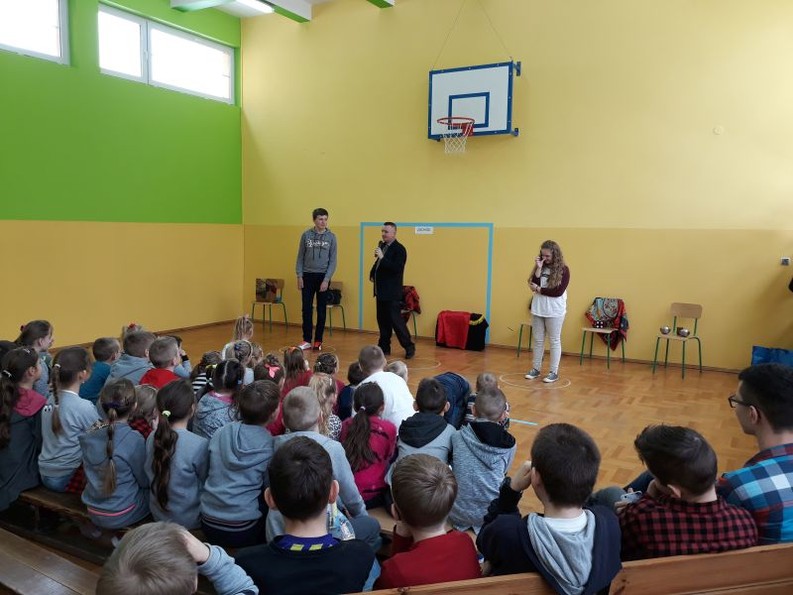 spośród publiczności uczniów, po to, aby również razem z nim uczestniczyli w