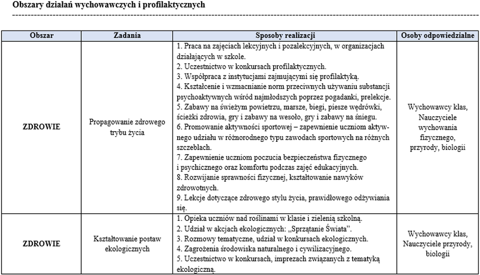 Zgodnie ze wskazaniami działalność wychowawczo-profilaktyczna w Szkole polega na prowadzeniu działań z zakresu promocji zdrowia oraz wspomaganiu ucznia w jego rozwoju ukierunkowanym na osiągnięcie pełnej dojrzałości w sferze: