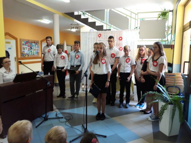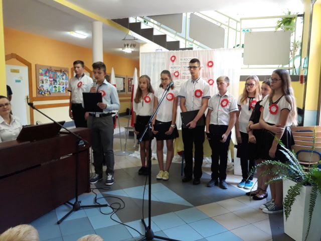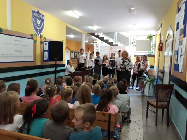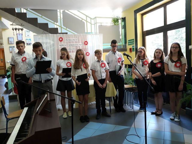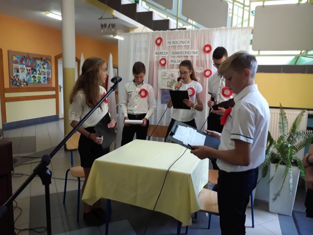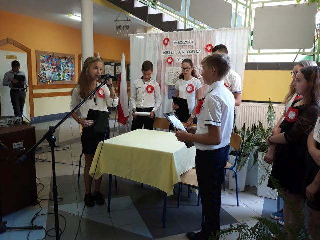 Uczniowie realizując zadania związane z obchodami stulecia niepodległości Polski przygotowali apel z okazji 79 rocznicy agresji radzieckiej na Polskę. W ramach realizacji projektu Szkoły Młodych Patriotów starają się pamiętać o ważnych dla nas Polaków rocznicach i osobach. Uroczystość przygotowali uczniowie klasy ósmej pod opieką Pani Elżbiety Jakubowicz oraz Pana Stanisława Janowskiego. W montażu słowno-muzycznym przypomnieli oni historię tamtych wydarzeń i przybliżyli młodszym kolegom postać Wacława Janusza – policjanta pochodzącego z Golcowej, zamordowanego w Miednoje. Na podsumowanie zebranym przypomniano o akcji „Katyń – ocalić od zapomnienia…”,