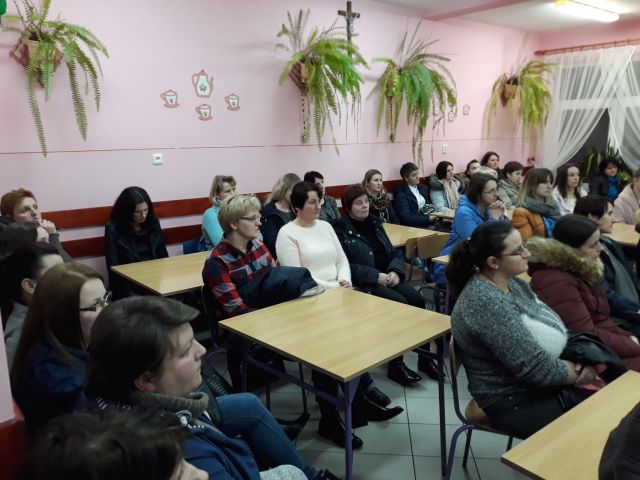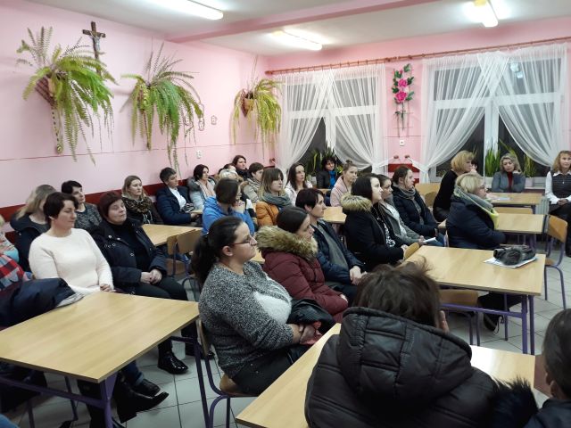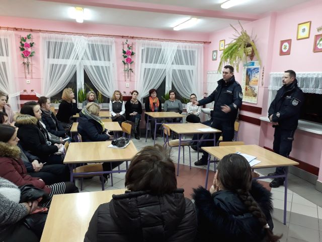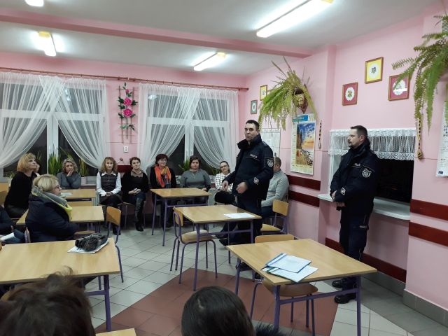 W drugiej części spotkania licznie zebrani Rodzice uczestniczyli w prelekcji na temat bezpieczeństwa dzieci i eliminowania wśród nich postaw niewłaściwego zachowania wygłoszonej przez młodszego aspiranta Policji w Domaradzu – Pana Witolda Burego, któremu towarzyszył starszy sierżant Marcin Stanisławczyk. Rodzice mieli okazję uświadomić sobie swoje obowiązki w zakresie wychowywania młodych pokoleń, które należy postrzegać jako ciągły proces wychowawczy, a nie jako odosobnione czynności dyscyplinujące. Przypomniał o prawach i obowiązkach Rodziców względem dzieci wynikających ze sprawowanej władzy rodzicielskiej zgodnie z „Kodeksem Rodzinnym i Opiekuńczym”, „Ustawą o postępowaniu w sprawach nieletnich”, „Kodeksem wykroczeń”. Mowa była również o odpowiedzialności cywilnej i karnej nieletnich. Dużo uwagi poświęcono konieczności eliminowania w zalążku niewłaściwego zachowania dzieci, które – jeśli nie jest na bieżąco korygowane – przeradza się w utrwalone zachowania negatywne o coraz większym agresywnym natężeniu. Podawane były przykłady agresji słownej i agresji fizycznej, a także ich skutki. Odwoływanie się mówiącego do przykładów z życia codziennego sprawiło, że zebrani z uwagą i zainteresowaniem słuchali skierowanych do nich słów. Pan Dzielnicowy poruszył również problemy związane zapewnieniem bezpieczeństwa dzieciom w czasie ferii zimowych, przypomniał zasady bezpiecznego przewożenia dzieci w samochodach osobowych. Była też mowa o obowiązkach właścicieli psów w zakresie sprawowania należytej kontroli nad czworonogami. Na koniec przypomniał o konieczności przestrzegania zasady ograniczonego zaufania w zakresie ochrony własnych danych osobowych.
