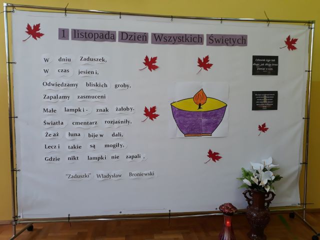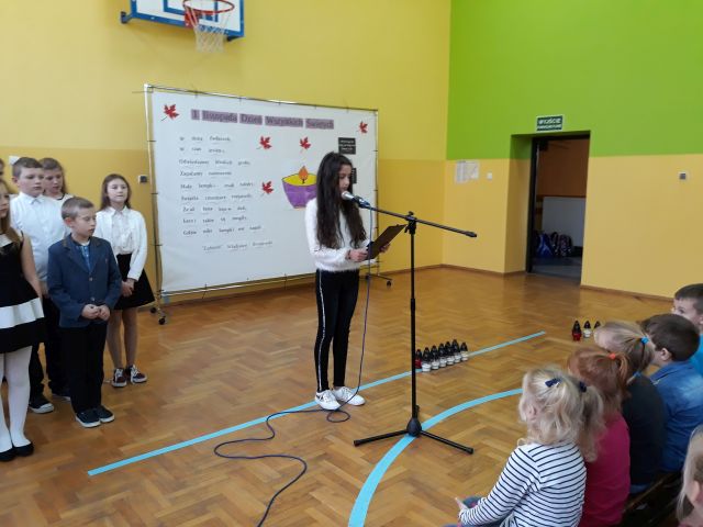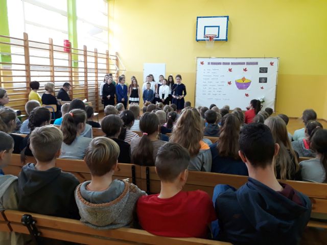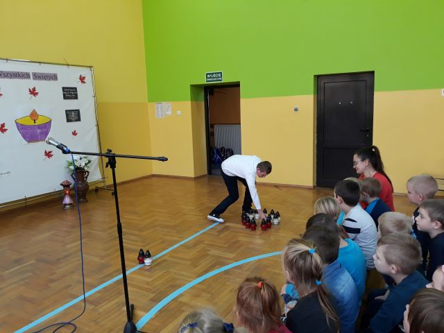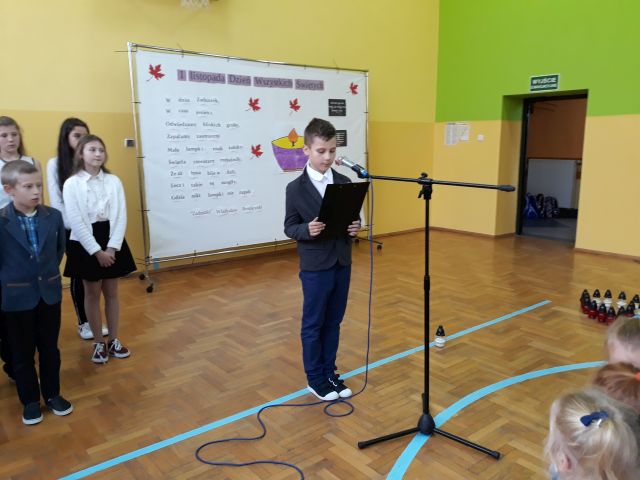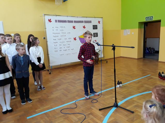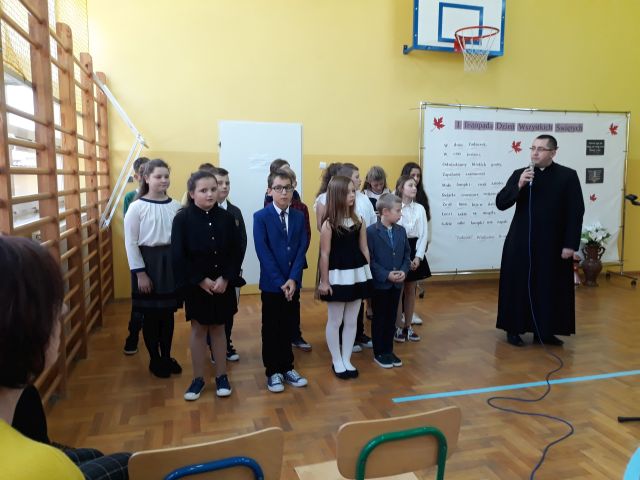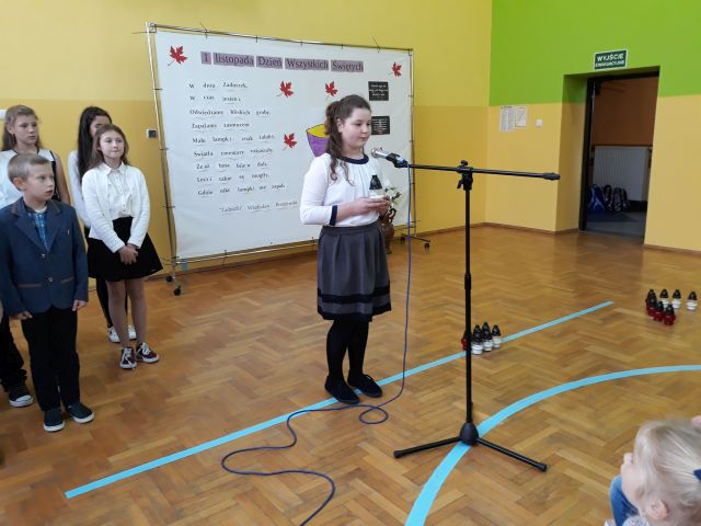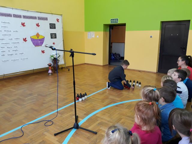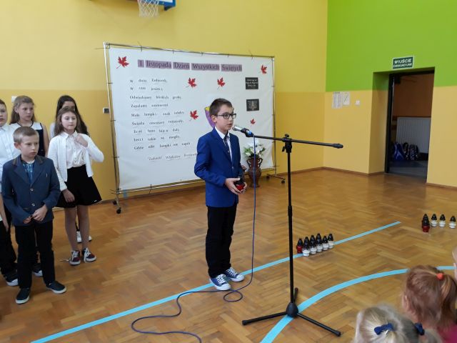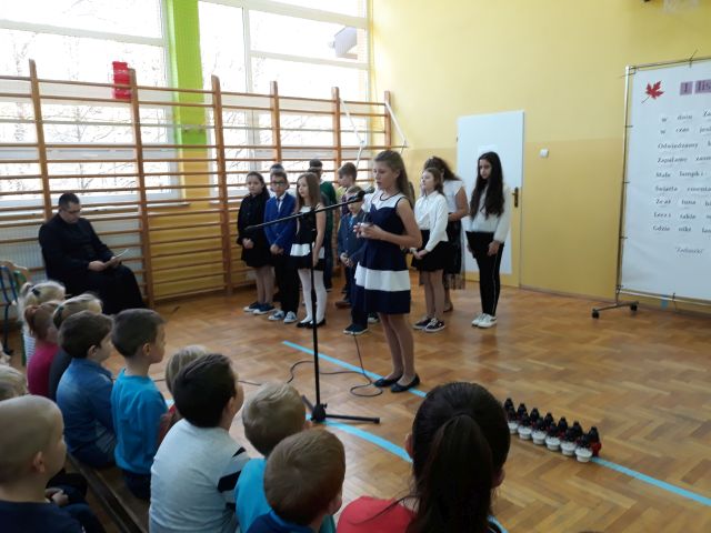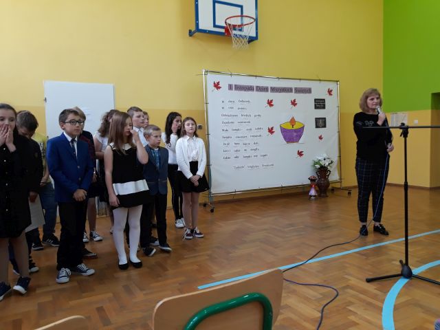 31 października uczniowie piątej klasy szkoły podstawowej wzięli udział w akademii mającej na celu ukazanie czym jest dla nas Uroczystość Wszystkich Świętych. Uświadomili wszystkim, że nie jest to święto smutne, ale ma głębokie przesłanie teologiczne związane z obcowaniem świętych. 1 listopada to dzień radości, w którym cieszymy się, że mamy orędowników w niebie, którymi są wszyscy zbawieni. Po występie uczniów głos zabrał ksiądz, który wyjaśnił teologiczne i historyczne znaczenie dwóch pierwszych dni listopada oraz przestrzegł przed tzw. „halloween”, które niesie ze sobą wiele zagrożeń duchowych dla człowieka. Uczniowie ustawili znicze w kształcie serca, które kolorami nawiązywały do setnej rocznicy odzyskania przez Polskę Niepodległości. Pokazali tym samym, że bardzo ważna jest pamięć o zmarłych wyrażająca się w modlitwie, zapaleniu znicza, czy postawieniu kwiatów na nagrobku.